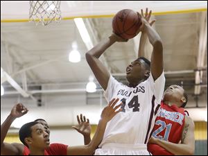 Scott's Rashad Lane (14) takes a shot against Bowsher's Jason Sandridge (5) and Eric Hopkins (21).