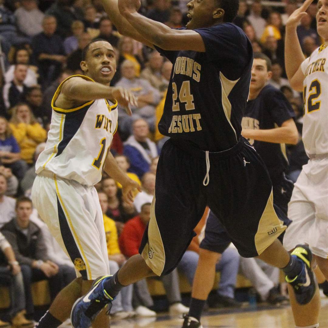 St. John's player D.J. Bonds guards Whitmer's Leroy Alexander.