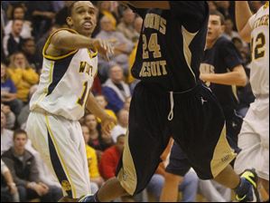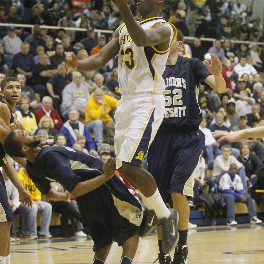 St. John's guard Anthony Glover shows enthusiasm as he goes for a shot but fails to score as Whitmer's Ricardo Smith watches.