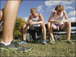 Napoleon's Steve Weaver, left, and Maumee's Willy Fink, right, cool off after the Northern Lakes League cross country championship meet at Pearson Metropark in Oregon, Saturday. Weaver won the race and Fink was second.