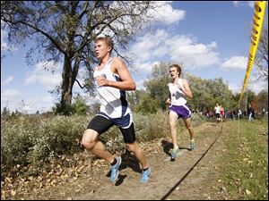 Bowling Green High School runners Marshall Kobylski, left, and Brian Seymour, right, lead the early stages of the race at the Northern Lakes League cross country championship meet at Pearson Metropark in Oregon, Saturday. Kobylski finished 5th and Seymour was 4th.
