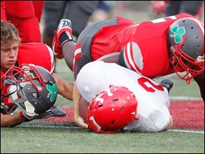 Central Catholic's Joe Solomon (26), left, loses his helmet as teammate Chris Green (45) tackles Bedford's Brad Boss (2).