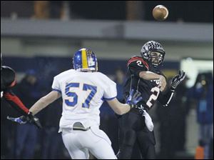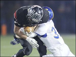 McComb High School player Cody Wilson, 27, loses the ball as he's hit by Delphos St. John's player Andrew Metzger, 5.