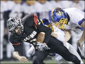 McComb High School player Dalton Buck, 2, is tackled by Delphos St. John's players Will Buettner, 81, and Cody Looser, 11.