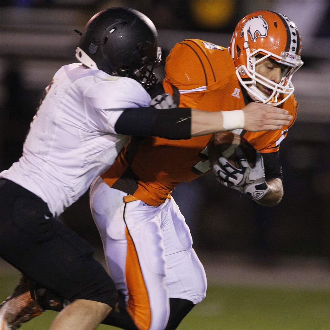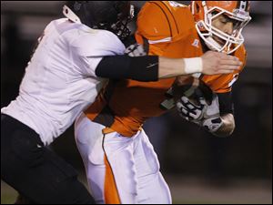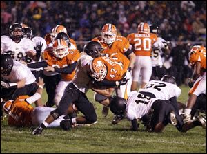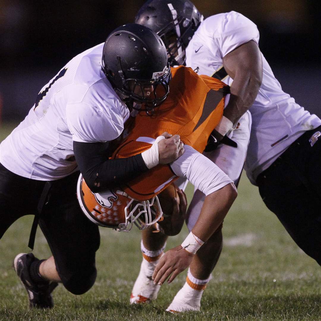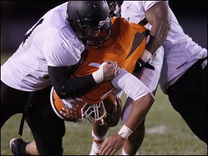 Southview's Austin Valdez, 1, is crushed by Perrysburg players Forrest Manning, 11, left, and Micah Carter, 45.