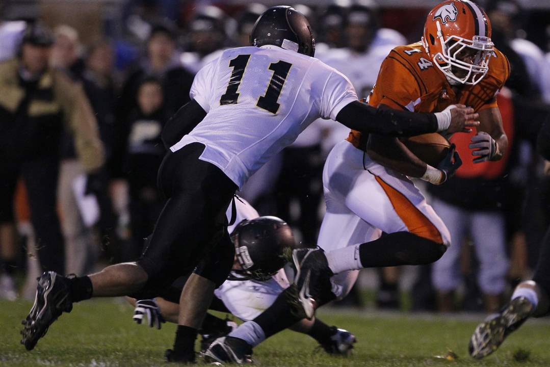 Sylvania Southview High School player Jay Fisher, 47, bulls his way into the end zone against Perrysburg High School player Tyler Gordon, 12, during the third quarter at Sylvania Northview, Friday, Sept. 30, 2011.