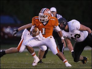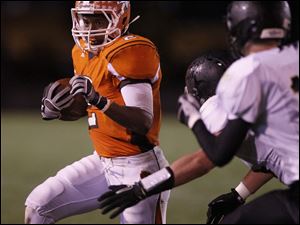 Southview player Jalen Marable, 2, tries to turn the corner against Perrysburg players during the second quarter.