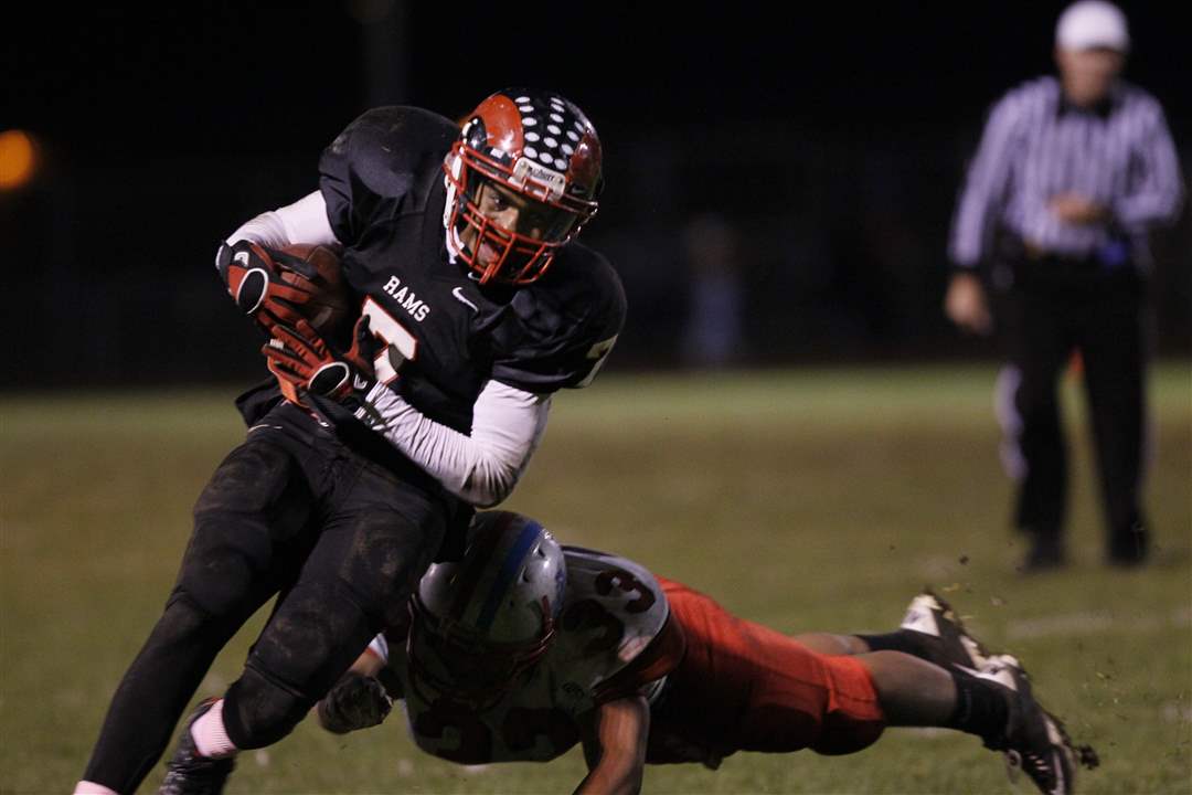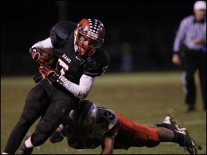 Bowsher defender Steven Johnson dives for Rogers player Juan Harris's legs for a tackle during Friday night's game at Rogers High School.