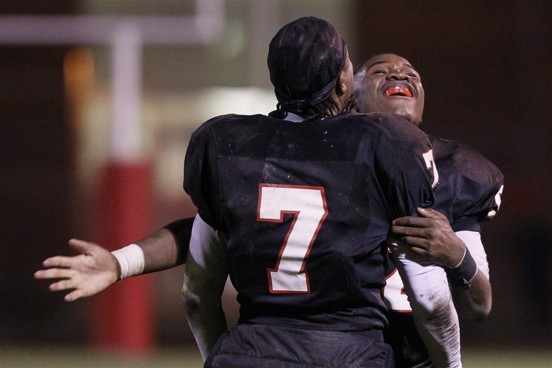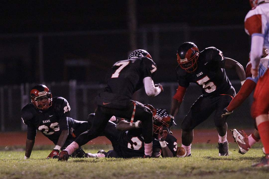 Rogers players Jalen Phelps, Juan Harris, Steven Carter and Pierre Harris scramble to recover a fumbled ball late in the fourth quarter.