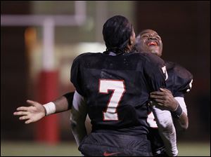 celebrate Friday night's victory against Bowsher after winning 18-17 in a closely contested game.