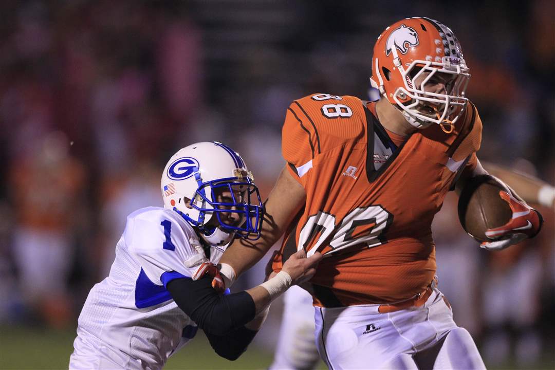SPT southviewfball15p Sylvania Southview player Allen Gant, 14, is finally brought down by Anthony Wayne High School player Reed Allen, 2, after a long gain in the second quarter at Northview High School, Friday, Oct. 14, 2011. The Blade/Andy Morrison