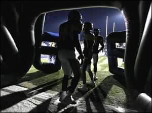 Whitmer High School players Jody Webb, 34, left, Michael Verroco, 13, and Alonzo Lucas, 6, prepare to take the field to play Anthony Wayne High School.