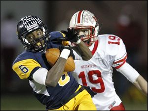 Whitmer's Alonzo Lucas, 6, hauls in a pass for a touchdown in front of Wadsworth's Jon Kuss, 19, during a Division I state playoff football game in Sandusky, Ohio, Saturday.