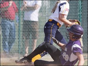 Notre Dame catcher Emily Lehnkuhl (3) tags out North Royalton's Laura Weible (12) after a throw to the plate by center fielder Molly Walters.