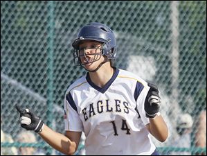 Notre Dame's Cassie Gillespie (14) scores against North Royalton catcher Lauren Oster (5) to tie the game 4-4 in the seventh inning.