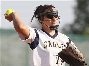 North Royalton pitcher Carly Gurka (6), right, frowns while talking with catcher Lauren Oster (5) after loading the bases against Notre Dame in the fourth inning.