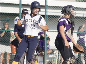 Notre Dame's Nikki Wilkins (12) scores the go ahead run against North Royalton catcher Lauren Oster (5).