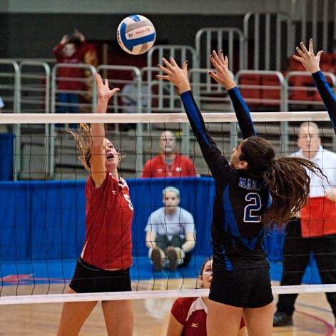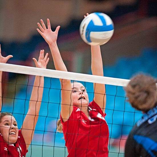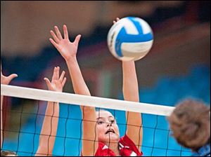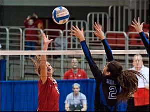 Bedford's Nicole Rightnowar, right, and MacKenzie Andrews attempt to block the spike attempt of a Bloomfield Hills Marian player.