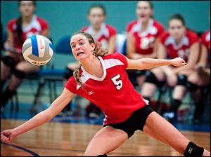 Bedford's Nicole Rightnowar digs a spike attempt against Bloomfield Hills Marian.