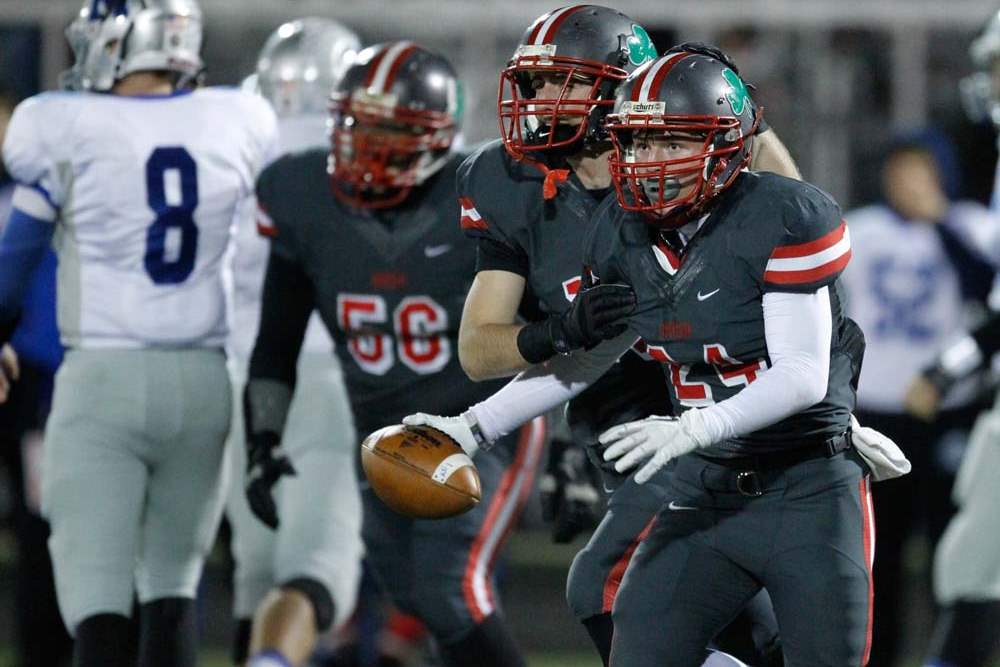 Toledo Central Catholic players Mitchell Cochell, 18, and Derich Weiland, 24, after Weiland intercepted a Grafton Midview pass during the first quarter of their Division II playoff game at Gallagher Stadium in Toledo.