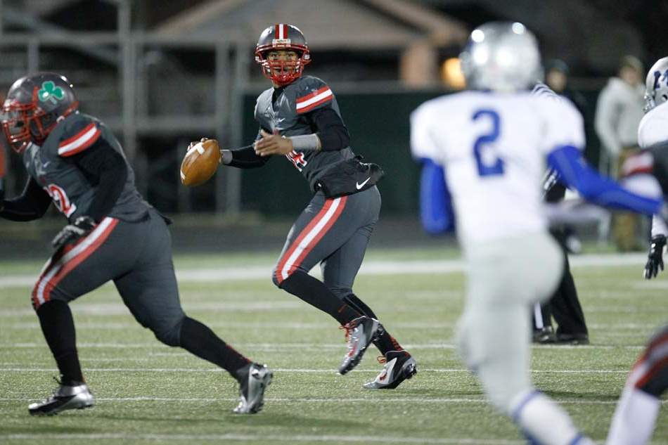 Toledo Central Catholic quarterback DeShone Kiser, 14, looks for a receiver during the second quarter against Grafton Midview of their Division II playoff game at Gallagher Stadium in Toledo.