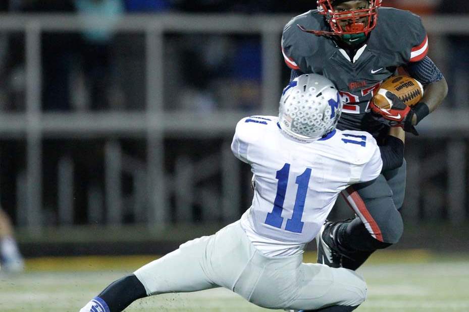Toledo Central Catholic player Tejuan James, 27, is tackled by Grafton Midview player Zach Bates, 11, after intercepting a pass during the second quarter of their Division II playoff game at Gallagher Stadium in Toledo.