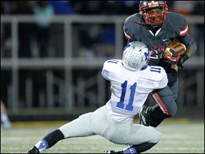 Toledo Central Catholic player Stephon Campbell, 31, is tackled by Grafton Midview player Zach Bates, 11, during the second quarter of their Division II playoff game at Gallagher Stadium in Toledo.