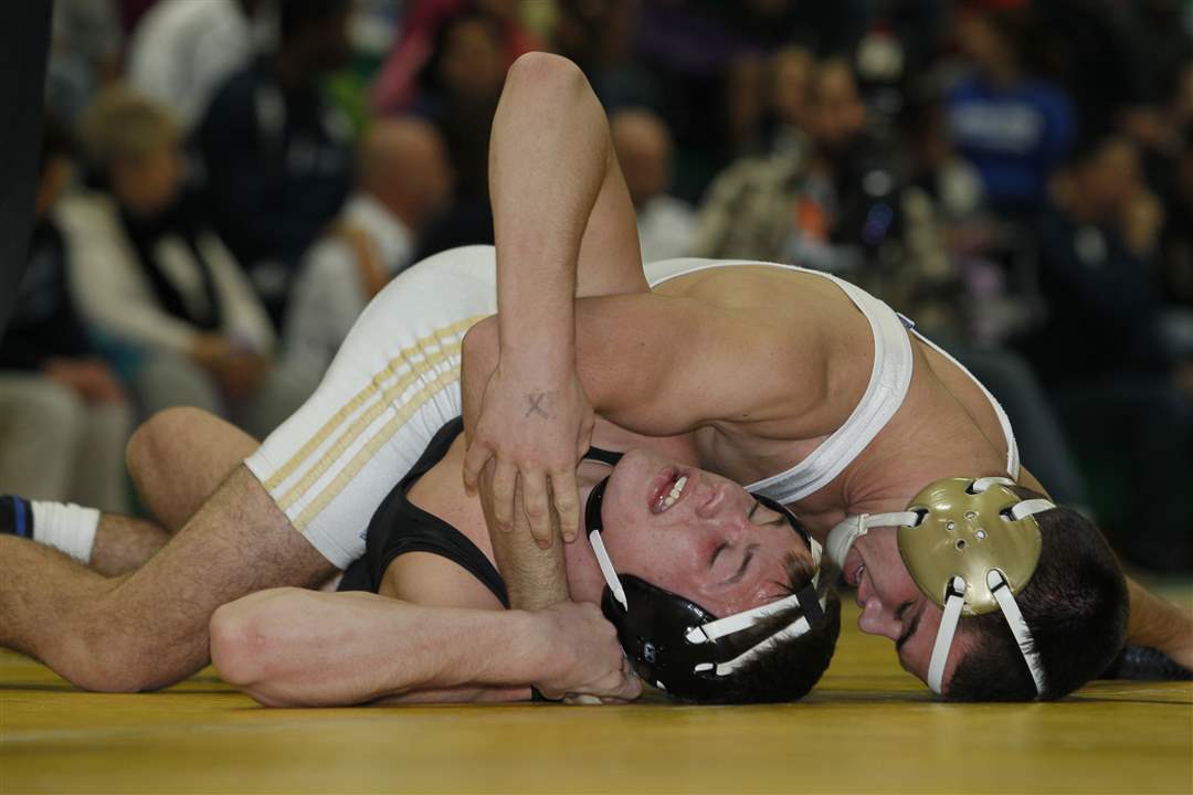 Perrysburg wrestler Kadin Llewellyn is pinned by Tiffin Columbian wrestler Jett Hurt during their 160 pound final at the Maumee Bay Classic Invitational wrestling tournament.