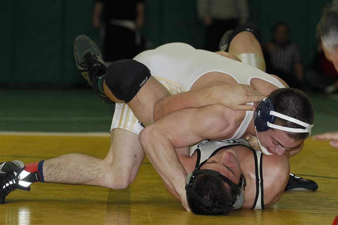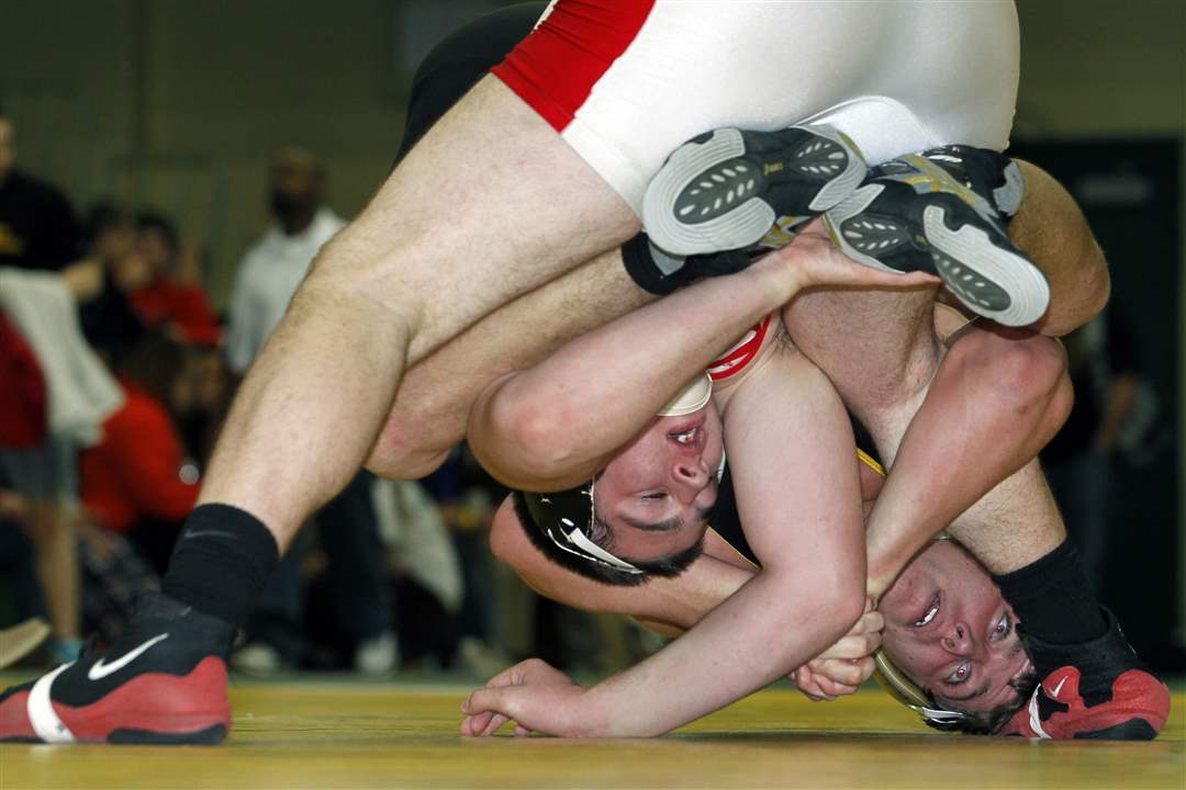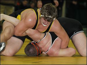 Delta wrestler Jared Mattin finds himself on his back against Seth Williams of Tiffin Columbian during their 152 pound final at the Maumee Bay Classic Invitational wrestling tournament.
