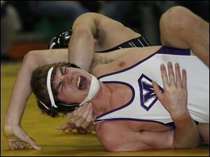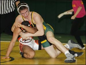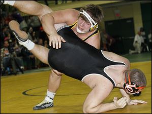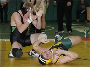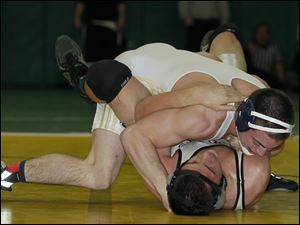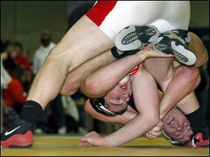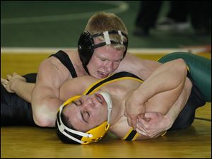 Maumee wrestler Rocco Caywood is turned by Vince PIckett of Central Crossing during their 170 pound final at the Maumee Bay Classic Invitational wrestling tournament.