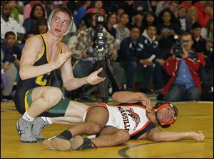 Oregon Clay wrestler Mike Screptock, left, celebrates his win over Ivan McClay of Massillon Washington during their 126 pound final at the Maumee Bay Classic Invitational wrestling tournament.