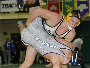 Oregon Clay wrestler Garrett Gray works to turn Justin Gillen of Liberty Center during their 285 pound final at the Maumee Bay Classic Invitational wrestling tournament at Oregon Clay High School, Saturday.
