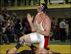 Delta wrestler Luke Kern scores back points on Oregon Clay wrestler Angelo Amenta to pull off a come-from-behind win during their 138 pound final at the Maumee Bay Classic Invitational wrestling tournament.