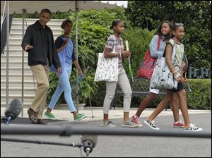 President Barack Obama, left, and his daughters Malia, second from left, and Sasha, right, walk past the press as they walk to Marine One on the South Lawn Friday