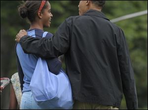 President Barack Obama puts his arm around daughter Malia as they and family friends walk to Marine One on the South Lawn of the White House before heading to Camp David Friday.