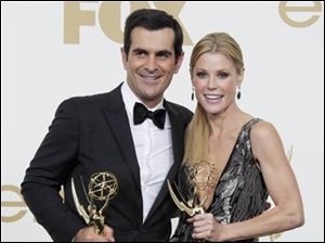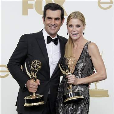 Ty Burrell, left, Julie Bowen from the television series "Modern Family" hold their Emmys for best supporting and actress actress in a comedy, backstage at the 63rd Primetime Emmy Awards.