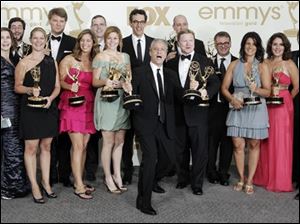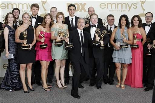 John Stewart and the crew of "The Daily Show with John Stewart" accept the award for outstanding variety, music, or comedy series for "The Daily Show with Jon Stewart" onstage at the 63rd Primetime Emmy Awards on Sunday.