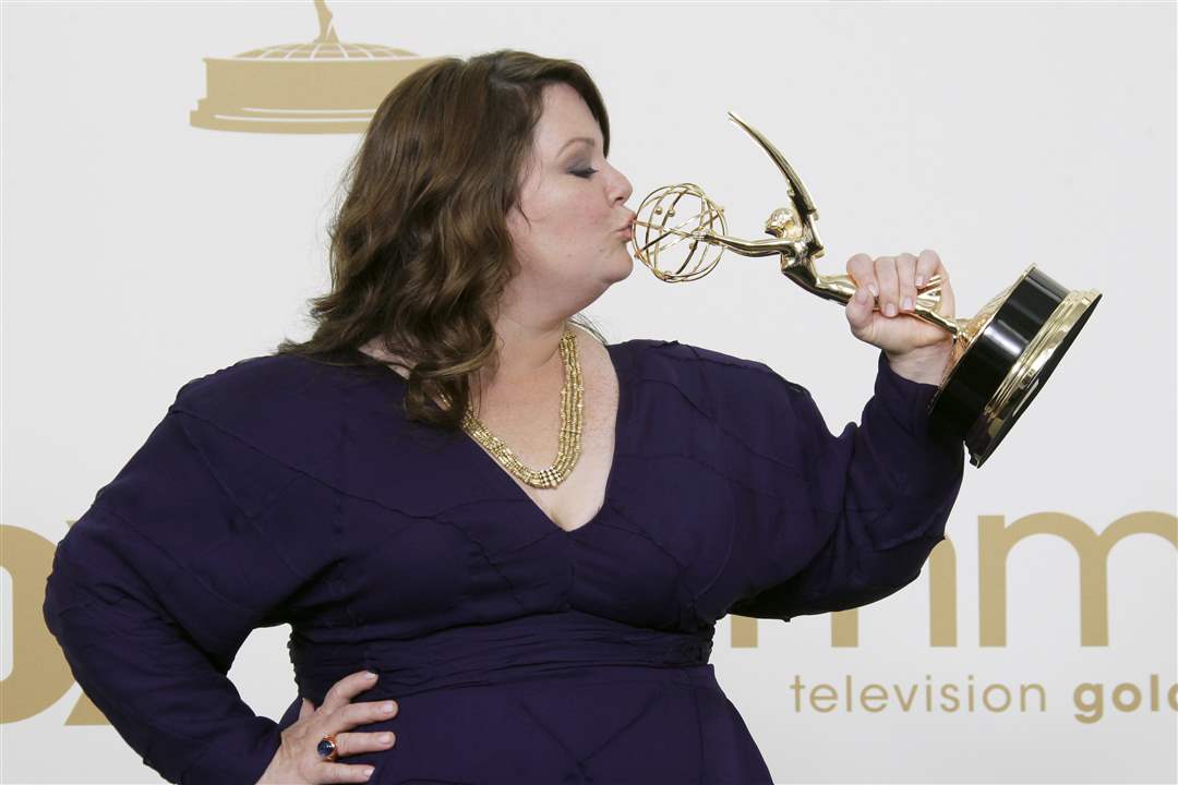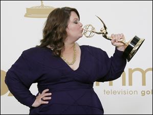 "Mike & Molly" cast member Melissa McCarthy holds the Emmy for best lead actress in a comedy series backstage at the 63rd Primetime Emmy Awards on Sunday in Los Angeles.