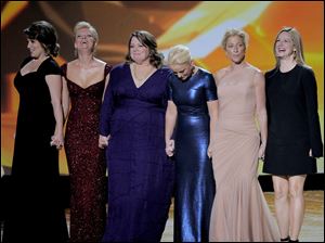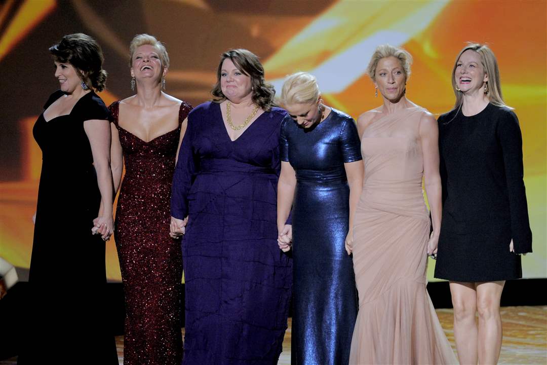 From left, Tina Fey, Martha Plimpton, Melissa McCarthy, Amy Poehler, Edie Falco, and Laura Linney are seen onstage as the award for outstanding lead actress in a comedy series is presented at the 63rd Primetime Emmy Awards on Sunday in Los Angeles.