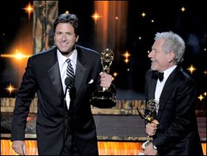 Steven Levitan, left, and Jeffrey Richman accept the award for outstanding writing for a comedy series for "Modern Family" at the 63rd Primetime Emmy Awards on Sunday in Los Angeles.