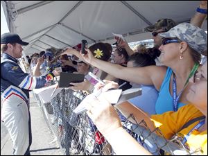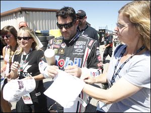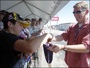 NASCAR driver Trevor Bayne, left, signs a car fender for fan Chad Molter, of Toledo. Molter said that he has more than 50 NASCAR memorabilia including a whole side of one of Jeff Gordon's cars, a piece of Dale Earnhardt, Sr.'s car, and at least 45 tires.