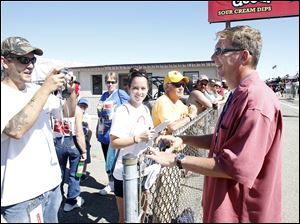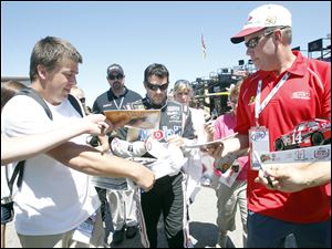 Roger Curtis, right, president of Michigan International Speedway, signs a visor for NASCAR fan Trudy Brenner, of Indiana, while Caitlin LaValley, of Battle Creek, Mich., center, waits for an autograph during a meet and greet at the speedway.