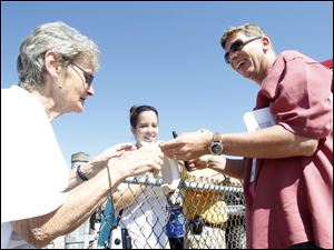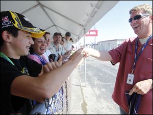 Roger Curtis, right, president of Michigan International Speedway, lets fans pick a gold or silver coin out of a bag that allows visitors special entries and access to the racecourse during the race.