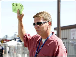 Roger Curtis, right, president of Michigan International Speedway, holds up 'Pre-Race Ceremony Passes' that he will be giving away to a few lucky fans.