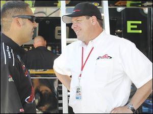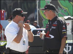 Terry Cook, competition director for Red Horse Racing and former Late Model track champion at Toledo, Sandusky and Flat Rock speedways, left, speaks with Butch Hylton, Timothy Peters crew chief, right, at Michigan International Speedway.