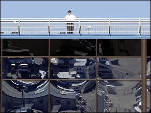 Sylvania native Terry Cook, competition director for Red Horse Racing, is the only person on the in the 'spotters area' before any pre-race practices for the Pure Michigan 400.