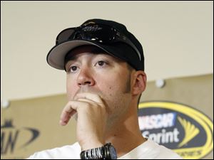 NASCAR driver Paul Menard pauses between questions from the media during Pure Michigan 400 pre race activity at Michigan International Speedway.