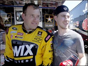 Driver Ryan Newman, left, poses for a picture with Brian Angel, right, of Toledo, in the infield.