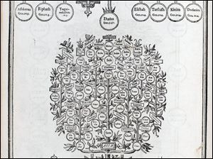 close-up of page showing Noah's genealogy inside a rare first edition of the King James Version bible, printed in 1611.