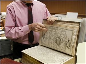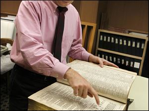 Ed Hill, curatorial assistant in the works of art on paper department at the Toledo Museum of Art, looks at two 400-year-old first edition King James Bibles that will be going on display at the museum. The one on the table has a binding from the late 19th century, the one he has open has a 17th century binding.